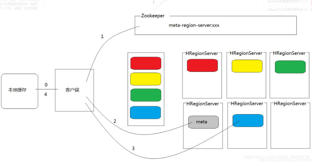 ①.当客户端联系HBase标识要读取某一张表时,根据表和行键确定出HRegion,找到存有该HRegion的HRegionServer,