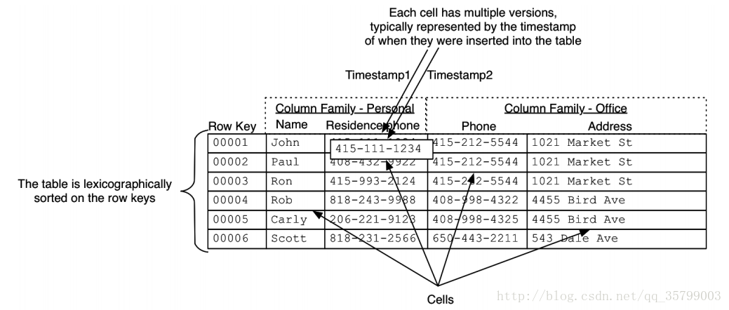 5. 单元格(Cell):Cell由行键,列族,列修饰符,时间戳唯一确定,时间戳表示版本。