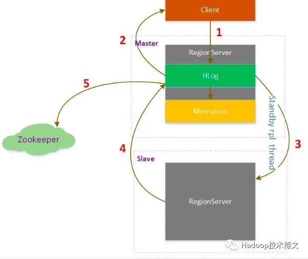 4. Slave处理完数据后返回给Master,Master收到Slave的返回信息,在Zookeeper中标记已经发送到Slave的HLog位置