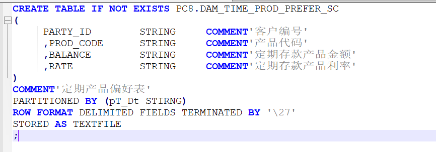 如上图中为一张hive表结构,该表为定期存款产品特征偏好表,主要做智能推荐,该表包括四个字段,其中客户编号(party_id)和产品代码(prod_code)为hive表中的主键.