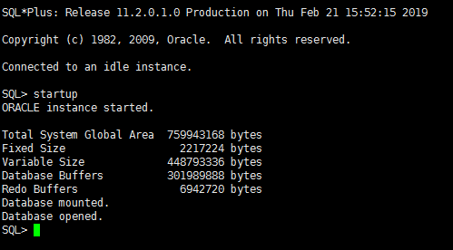 [oracle@localhost ~]$ sqlplus as sysdba;bash: sqlplus: command not found[oracle@localhost ~]$ source .bash_profile[oracle@localhost ~]$ echo $ORACLE_SIDstandby[oracle@localhost ~]$ echo $ORACLE_HOME/u01/app/oracle/product/11.2.0.4[oracle@localhost ~]$ sqlplus as sysdba;SQL*Plus: Release 11.2.0.4.0 Production on Wed May 27 09:21:12 2020Copyright (c) 1982, 2013, Oracle. All rights reserved.Connected to an idle instance.SQL> startup;ORACLE instance started.Total System Global Area 534462464 bytesFixed Size 2254952 bytesVariable Size 213911448 bytesDatabase Buffers 314572800 bytesRedo Buffers 3723264 bytesDatabase mounted.Database opened.SQL>