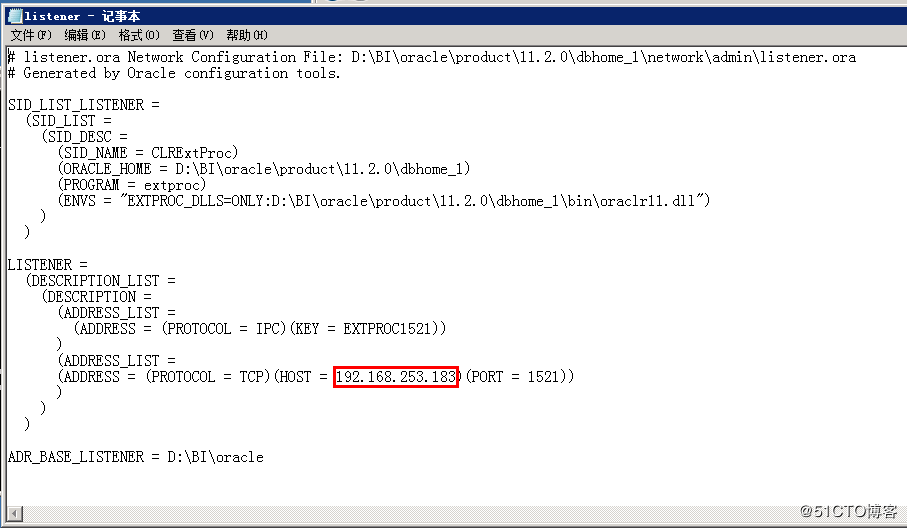 LISTENER_ORCL =(ADDRESS = (PROTOCOL = TCP)(HOST = node01)(PORT = 1521))ORCL =(DESCRIPTION =(ADDRESS = (PROTOCOL = TCP)(HOST = node01)(PORT = 1521))(CONNECT_DATA =(SERVER = DEDICATED)(SERVICE_NAME = orcl)))ncbodsdb =(DESCRIPTION =(ADDRESS = (PROTOCOL = TCP)(HOST = node01)(PORT = 1521))(CONNECT_DATA =(SERVER = DEDICATED)(SERVICE_NAME = ncbodsdb)))