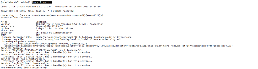 Service "9fa6961413745d54e0537bff1aacfe84" has 1 instance(s).Instance "orcl", status READY, has 1 handler(s) for this service...Service "ncbodsdb" has 1 instance(s).Instance "orcl", status READY, has 1 handler(s) for this service...Service "orcl" has 1 instance(s).Instance "orcl", status READY, has 1 handler(s) for this service...Service "orclXDB" has 1 instance(s).Instance "orcl", status READY, has 1 handler(s) for this service...The command completed successfully