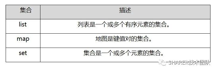除基础类型外,支持了3种集合类型,如下表所示