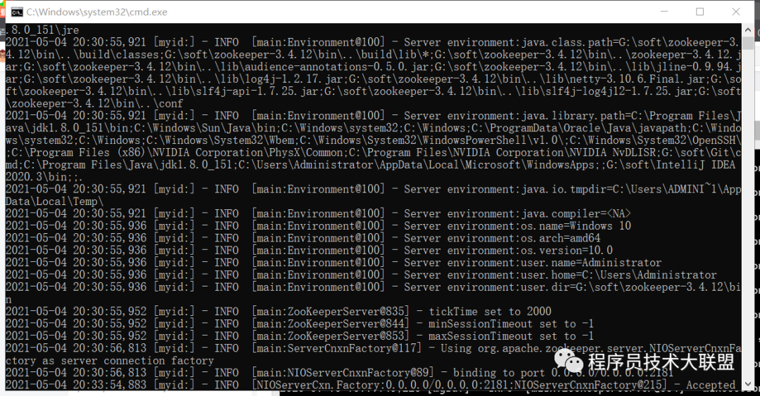 5.打开新的cmd,输入“zkServer“,运行Zookeeper,出现下图的结果代表启动成功。