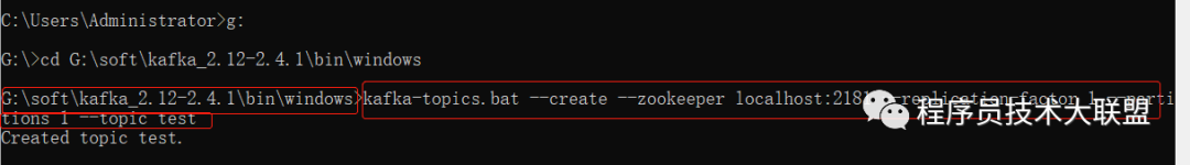 4.接下来我们可以来测试了,首先创建一个topic为test,打开一个新的cmd窗口,进入解压的bin目录里的windos的bat脚本所在的目录(第一个红框是我本地解压的路径),执行第二个红框的命令(kafka-topics.bat --create --zookeeper localhost:2181 --replication-factor 1 --partitions 1 --topic test