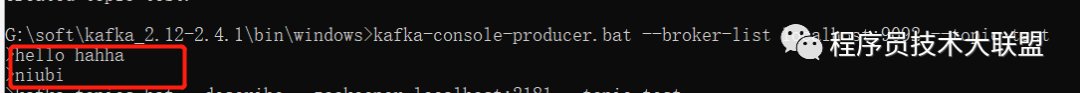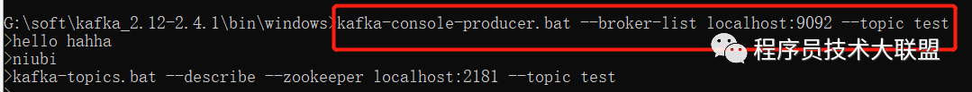 5.然后我们在刚才创建topic的窗口里创建一个消息的生产者(kafka-console-producer.bat --broker-list localhost:9092 --topic test):