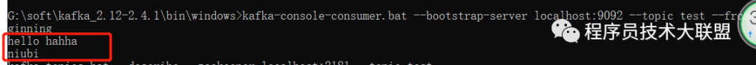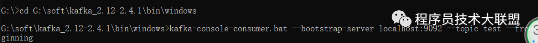 6.接着我们新打开一个cmd窗口,老套路来创建一个消费者来接收生产者生产的消息(kafka-console-consumer.bat --bootstrap-server localhost:9092 --topic test --from-beginning):