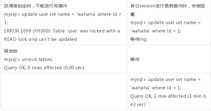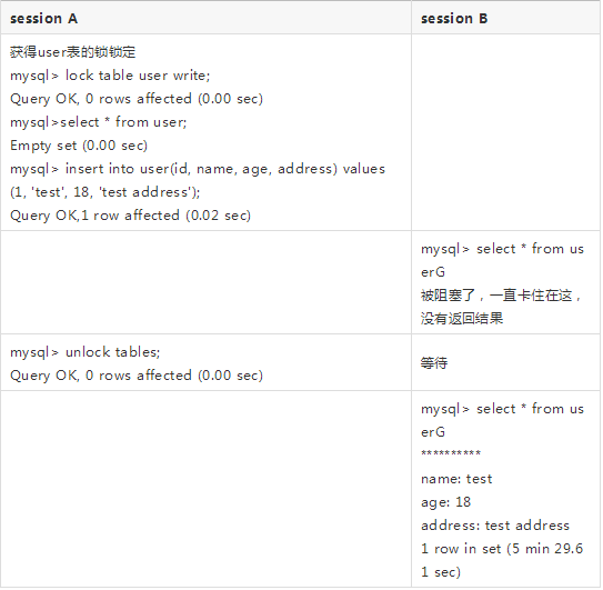 可以看出,通过lock table user write将user表锁住后,其它用户进行对该表操作时,都会被阻塞。