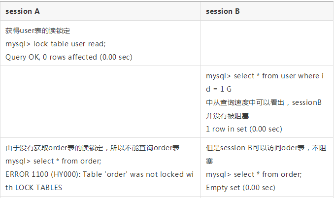 在用LOCK TABLES给表显式加表锁时,必须同时取得所有涉及到表的锁,并且MySQL不支持锁升级。也就是说,在执行LOCK TABLES后,只能访问显式加锁的这些表,不能访问未加锁的表;同时,如果加的是读锁,那么只能执行查询操作,而不能执行更新操作。其实,在自动加锁的情况下也基本如此,MyISAM总是一次获得SQL语句所需要的全部锁。这也正是MyISAM表不会出现死锁(Deadlock Free)的原因。