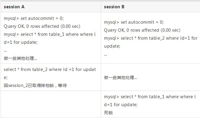 上面知识点说过,MyISAM表锁是deadlock free的,这是因为MyISAM总是一次获得所需的全部锁,要么全部满足,要么等待,因此不会出现死锁。但在InnoDB中,除单个SQL组成的事务外,锁是逐步或得的,所以InnoDB发生死锁是可能的。