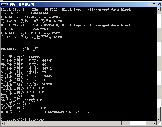 分析结果发现 SYSAUX01.DBF 文件数据块(Data)检测失败 40 页,索引页(Index) 检测失败 29 页,其他文件检测正常。