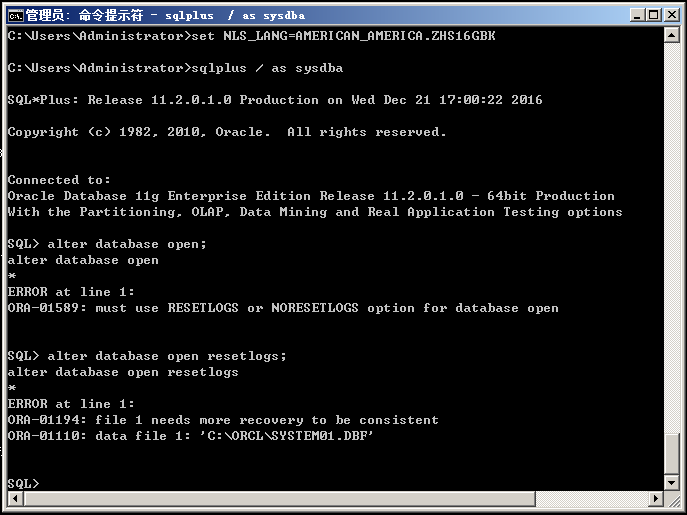 故障主要表现为打开数据库时报错,内容为:“system01.dbf 需要更多的恢复来保持一致性,数据库无法打开”。经过对数据库文件的检测后初步可得出以下结论:sysaux01.dbf 有坏块,sysaux01.dbf 文件损坏。急需恢复 zxfg 用户下的数据。