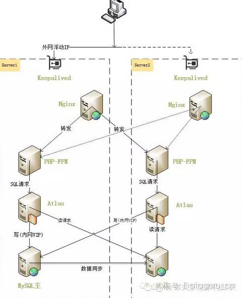 此架构主要是由keepalived实现双机高可用,维护了一个外网VIP,一个内网VIP。正常情况时,外网VIP和内网VIP都绑定在server1服务器,web请求发送到server1的Nginx,nginx对于静态资源请求就直接在本机检索并返回,对于PHP的动态请求,则负载均衡到server1和server2。对于SQL请求,会将此类请求发送到Atlasmysql中间件,Atlas接收到请求之后,把涉及写操作的请求发送到内网VIP,读请求操作发送到server2,这样就实现了读写分离。