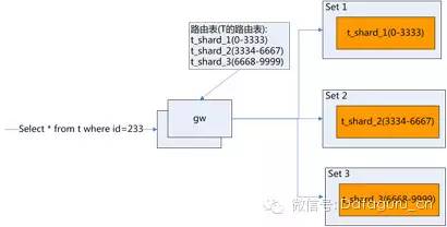 在TDSQL中,每个表(逻辑表)可能会拆分成多个子表(建表的时候通过在建表语句中嵌入注释的方式提供一个shard字段名,最多会拆分出1W个子表),每个子表在MySQL上都是一个真实的物理表,这里称为一个shard,因此一张表的数据可能会按这样的方式分布在多个Set中,如图2所示