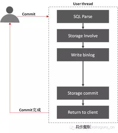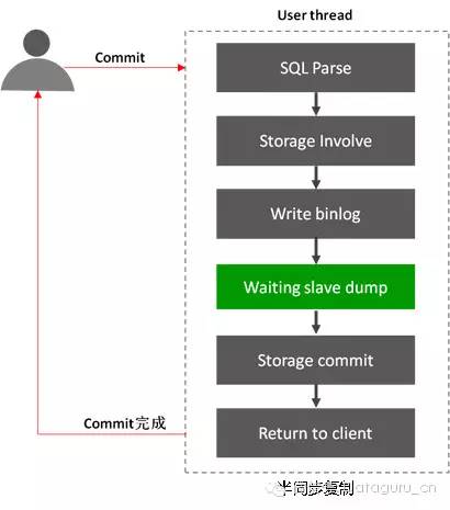 图4是异步复制的大致流程,很显然主机提交了binlog就会返回给业务成功,没有保证binlog同步到了备机,这样在切换的瞬间很有可能丢失这部分事务。