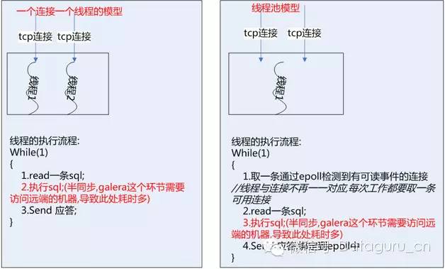 不过在MySQL5.6企业版和MariaDB、Percona中都引入了线程池,使得网络模型灵活了很多,图7是简化后的对比模型。