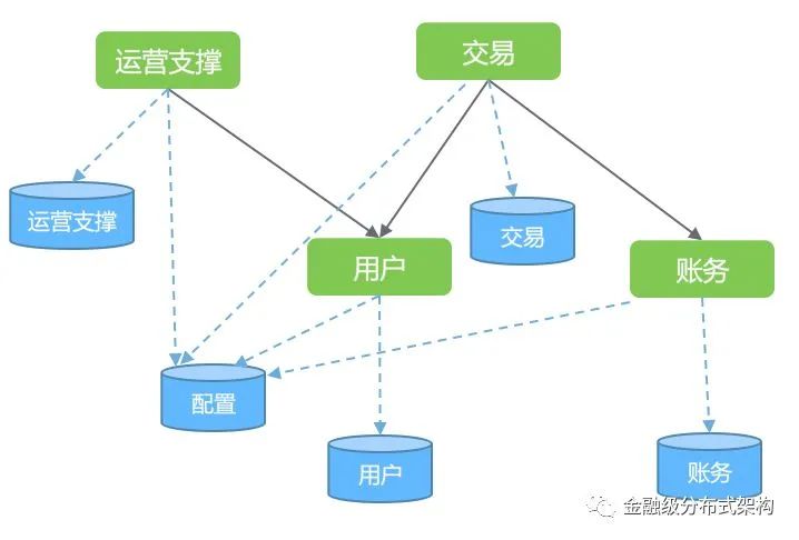 我们抽象一个简化的支付系统模型来帮助理解,为了叙述方便,不一定跟支付宝的实际业务情况完全一致。它采用 SOA 架构,主要划分了交易、账务、用户、运营支撑这几个子系统,各自有各自的数据库。另外还有一个全局的配置库,存放一些会被各处用到的配置数据。