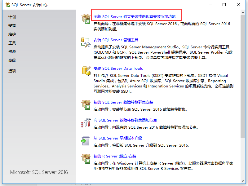3.在出现的SQL server安装中心的界面当中,点击“全新SQL SERVER独立安装或向现有安装添加功能”。