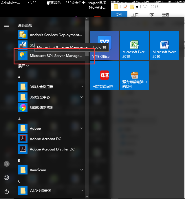 6、安装完成后,在程序中,可以查看到SQL Server Managemnet Studio 18管理软件。