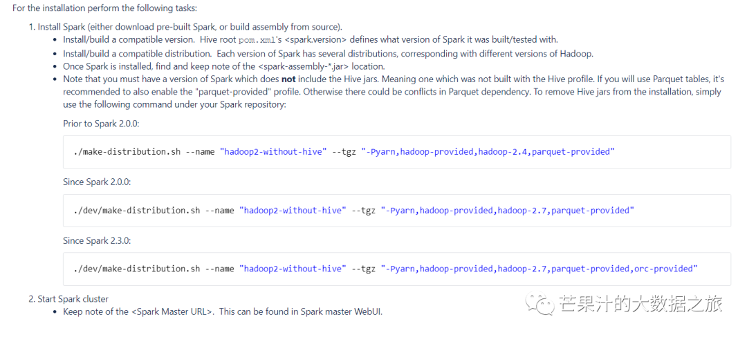 Prior to Spark 2.0.0:#spark2.0.0之前./make-distribution.sh --name "hadoop2-without-hive" --tgz "-Pyarn,hadoop-provided,hadoop-2.4,parquet-provided"Since Spark 2.0.0:#spark2.0.0以后./dev/make-distribution.sh --name "hadoop2-without-hive" --tgz "-Pyarn,hadoop-provided,hadoop-2.7,parquet-provided"Since Spark 2.3.0:#spark2.3.0之后./dev/make-distribution.sh --name "hadoop2-without-hive" --tgz "-Pyarn,hadoop-provided,hadoop-2.7,parquet-provided,orc-provided"