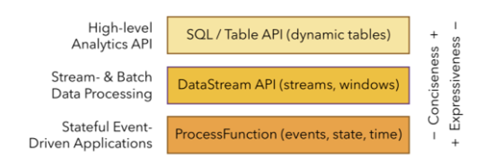 最底层级的抽象仅仅提供了有状态流,它将通过过程函数(Process Function)被嵌入到DataStream API中。底层过程函数(Process Function) 与 DataStream API 相集成,使其可以对某些特定的操作进行底层的抽象,它允许用户可以自由地处理来自一个或多个数据流的事件,并使用一致的容错的状态。除此之外,用户可以注册事件时间并处理时间回调,从而使程序可以处理复杂的计算。