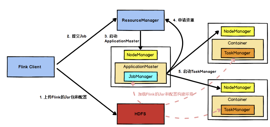 Flink任务提交后,Client向HDFS上传Flink的Jar包和配置,之后向Yarn ResourceManager提交任务,ResourceManager分配Container资源并通知对应的NodeManager启动ApplicationMaster,ApplicationMaster启动后加载Flink的Jar包和配置构建环境,然后启动JobManager,之后ApplicationMaster向ResourceManager申请资源启动TaskManager,ResourceManager分配Container资源后,由ApplicationMaster通知资源所在节点的NodeManager启动TaskManager,NodeManager加载Flink的Jar包和配置构建环境并启动TaskManager,TaskManager启动后向JobManager发送心跳包,并等待JobManager向其分配任务。