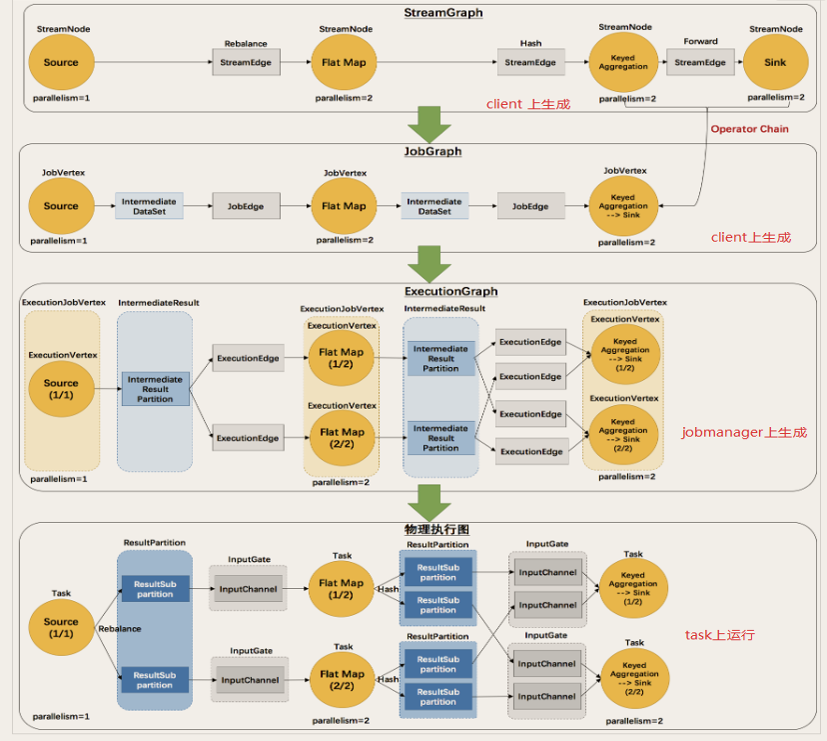 Flink 中的执行图可以分成四层:StreamGraph -> JobGraph -> ExecutionGraph -> 物理执行图。