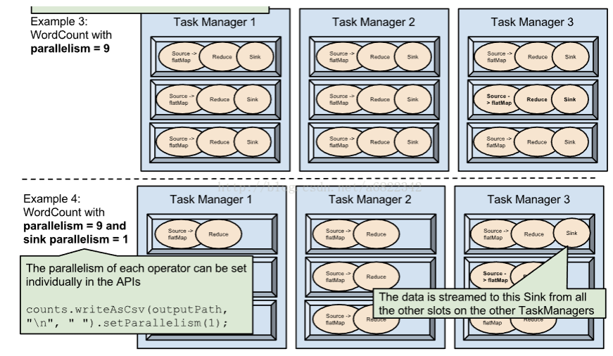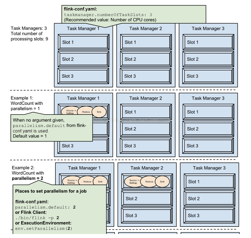 也就是说,假设一共有3个TaskManager,每一个TaskManager中的分配3个TaskSlot,也就是每个TaskManager可以接收3个task,一共9个TaskSlot,如果我们设置parallelism.default=1,即运行程序默认的并行度为1,9个TaskSlot只用了1个,有8个空闲,因此,设置合适的并行度才能提高效率。