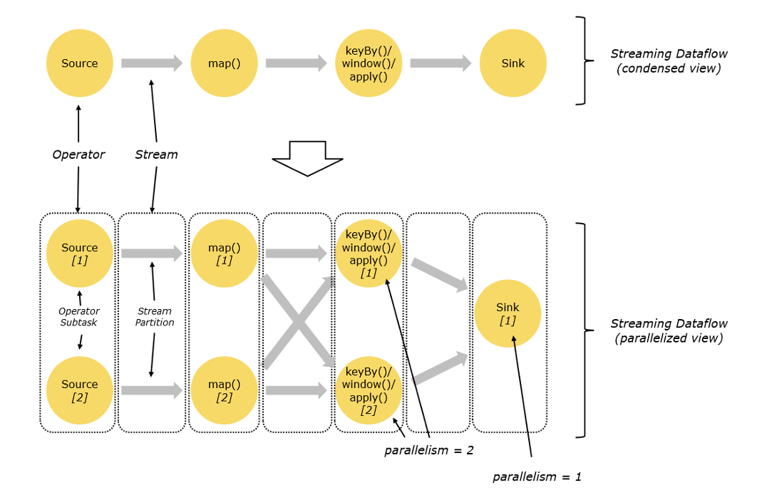 一个特定operator的subtask的个数被称之为其parallelism(并行度)。一个stream的并行度总是等同于其producing operator的并行度。一个程序中,不同的operator可能具有不同的并行度。