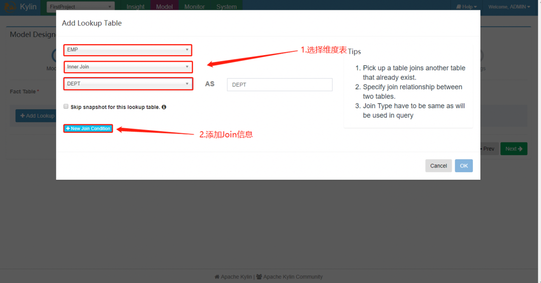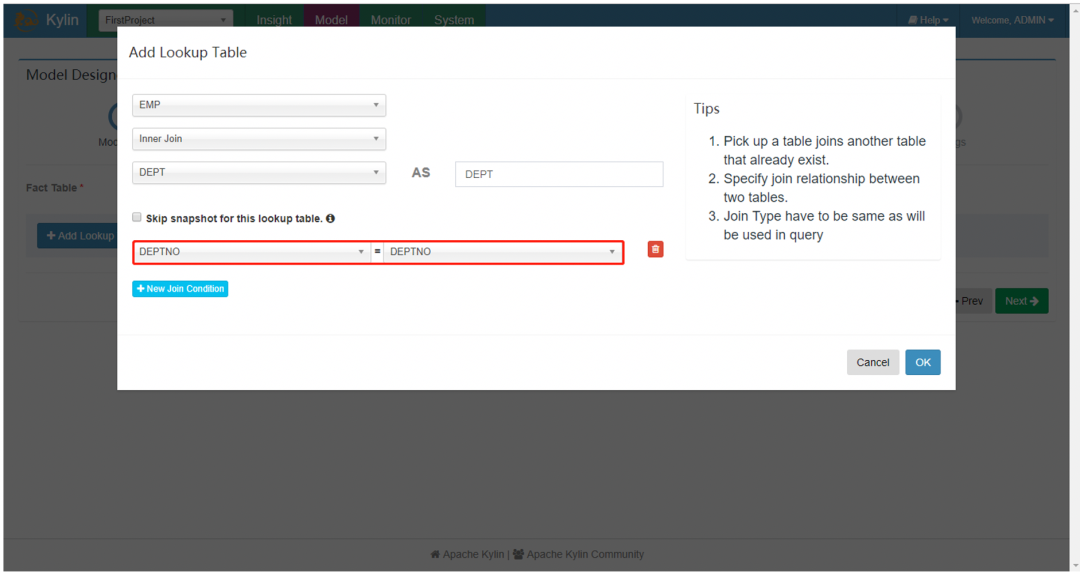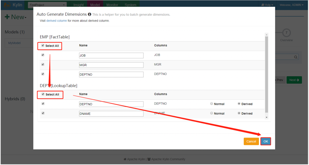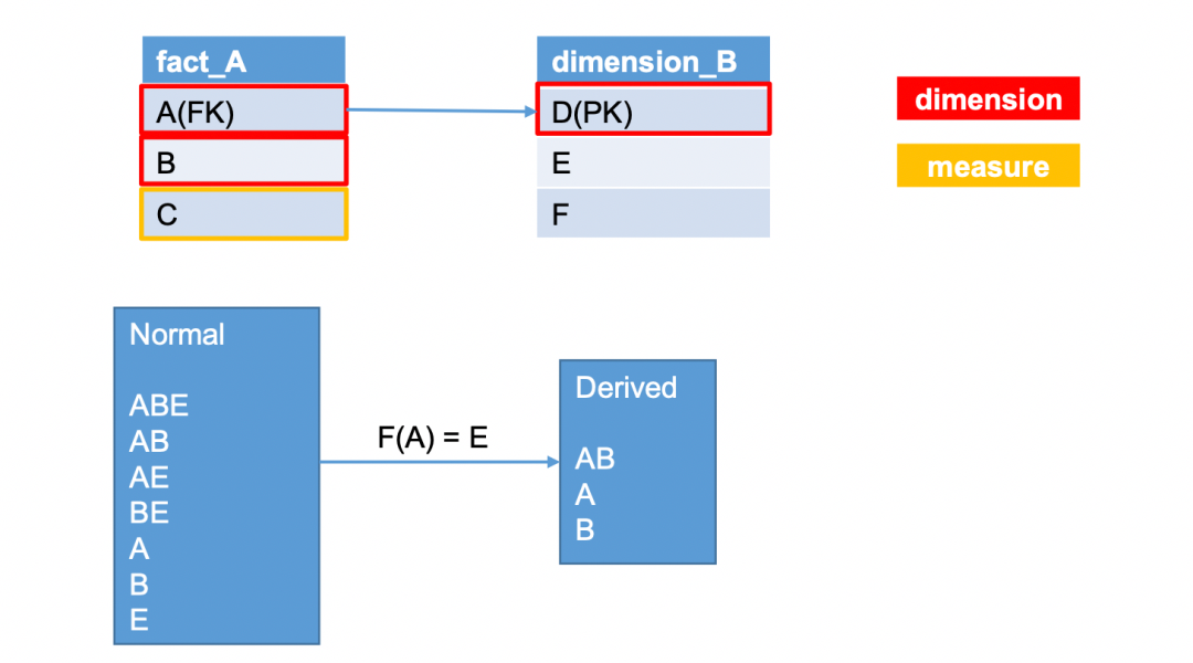衍生维度用于在有效维度内将维度表上的非主键维度排除掉,并使用维度表的主键(其实是事实表上相应的外键)来替代它们。Kylin会在底层记录维度表主键与维度表其他维度之间的映射关系,以便在查询时能够动态地将维度表的主键“翻译”成这些非主键维度,并进行实时聚合。