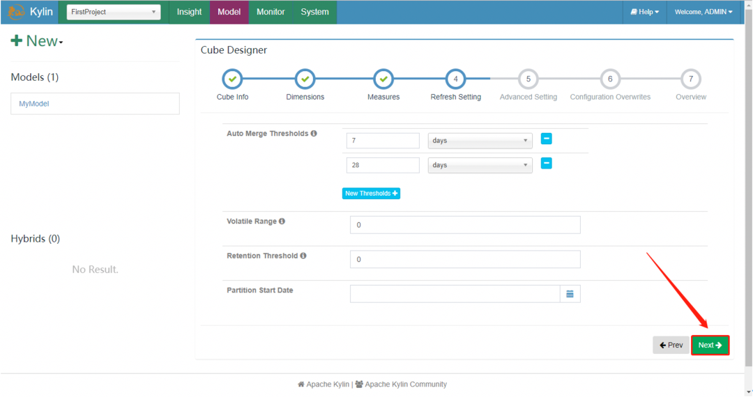 聚合组的设计非常灵活,甚至可以用来描述一些极端的设计。假设我们的业务需求非常单一,只需要某些特定的Cuboid,那么可以创建多个聚合组,每个聚合组代表一个Cuboid。具体的方法是在聚合组中先包含某个Cuboid所需的所有维度,然后把这些维度都设置为强制维度。这样当前的聚合组就只能产生我们想要的那一个Cuboid了。