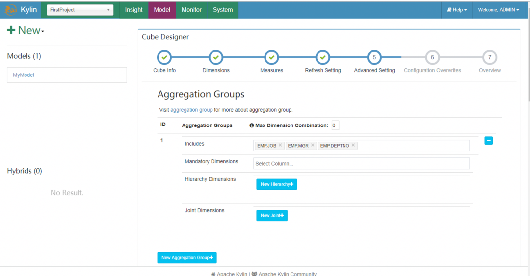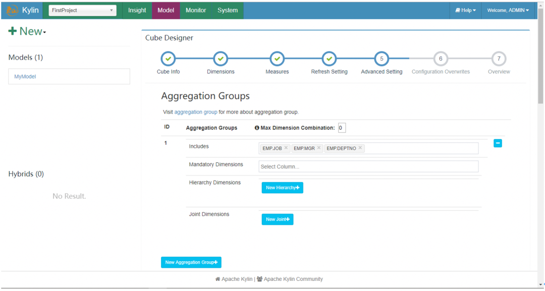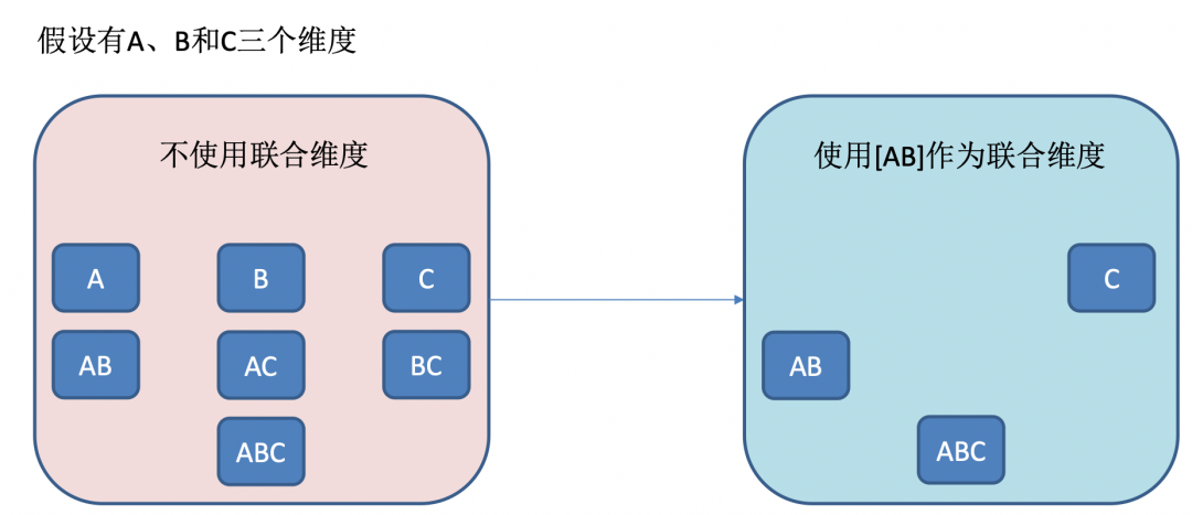 3)联合维度(Joint),每个联合中包含两个或更多个维度,如果某些列形成一个联合,那么在该分组产生的任何Cuboid中,这些联合维度要么一起出现,要么都不出现。每个分组中可以有0个或多个联合,但是不同的联合之间不应当有共享的维度(否则它们可以合并成一个联合)。如果根据这个分组的业务逻辑,多个维度在查询中总是同时出现,则可以在该分组中把这些维度设置为联合维度。