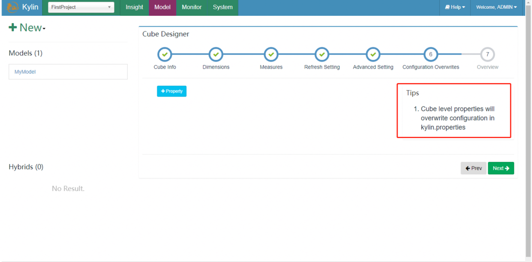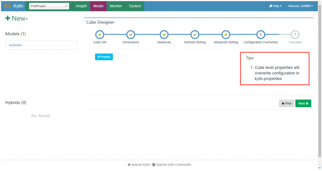 由于每个Cube的并发粒度控制不尽相同,因此建议在Cube Designer 的Configuration Overwrites(上图所示)中为每个Cube量身定制控制并发粒度的参数。假设将把当前Cube的kylin.hbase.region.count.min设置为2,kylin.hbase.region.count.max设置为100。这样无论Segment的大小如何变化,它的分区数量最小都不会低于2,最大都不会超过100。相应地,这个Segment背后的存储引擎(HBase)为了存储这个Segment,也不会使用小于两个或超过100个的分区。我们还调整了默认的kylin.hbase.region.cut,这样50GB的Segment基本上会被分配到50个分区,相比默认设置,我们的Cuboid可能最多会获得5倍的并发量。