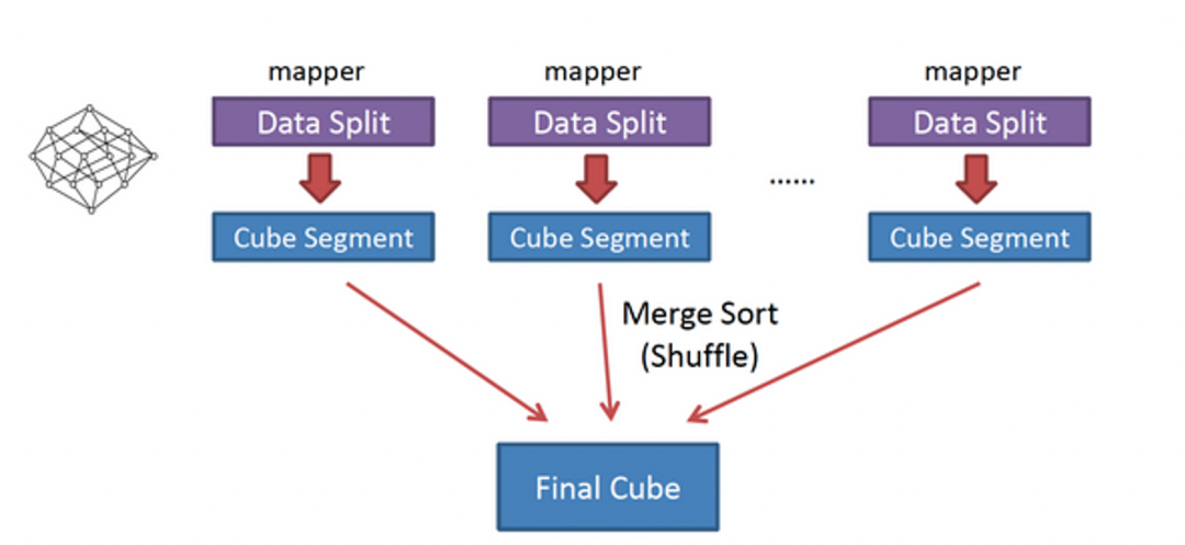 也被称作“逐段”(By Segment) 或“逐块”(By Split) 算法,从1.5.x开始引入该算法,该算法的主要思想是,每个Mapper将其所分配到的数据块,计算成一个完整的小Cube 段(包含所有Cuboid)。每个Mapper将计算完的Cube段输出给Reducer做合并,生成大Cube,也就是最终结果。如图所示解释了此流程。