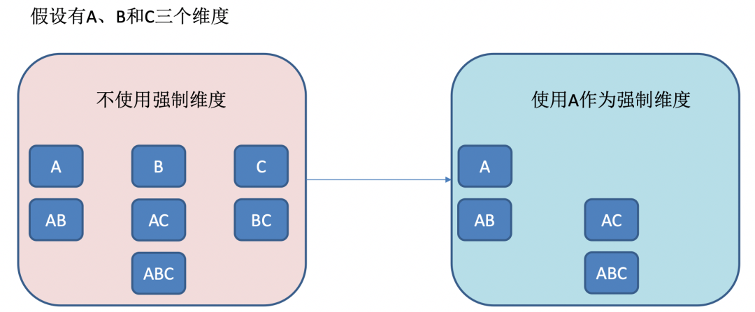 1)强制维度(Mandatory),如果一个维度被定义为强制维度,那么这个分组产生的所有Cuboid中每一个Cuboid都会包含该维度。每个分组中都可以有0个、1个或多个强制维度。如果根据这个分组的业务逻辑,则相关的查询一定会在过滤条件或分组条件中,因此可以在该分组中把该维度设置为强制维度。