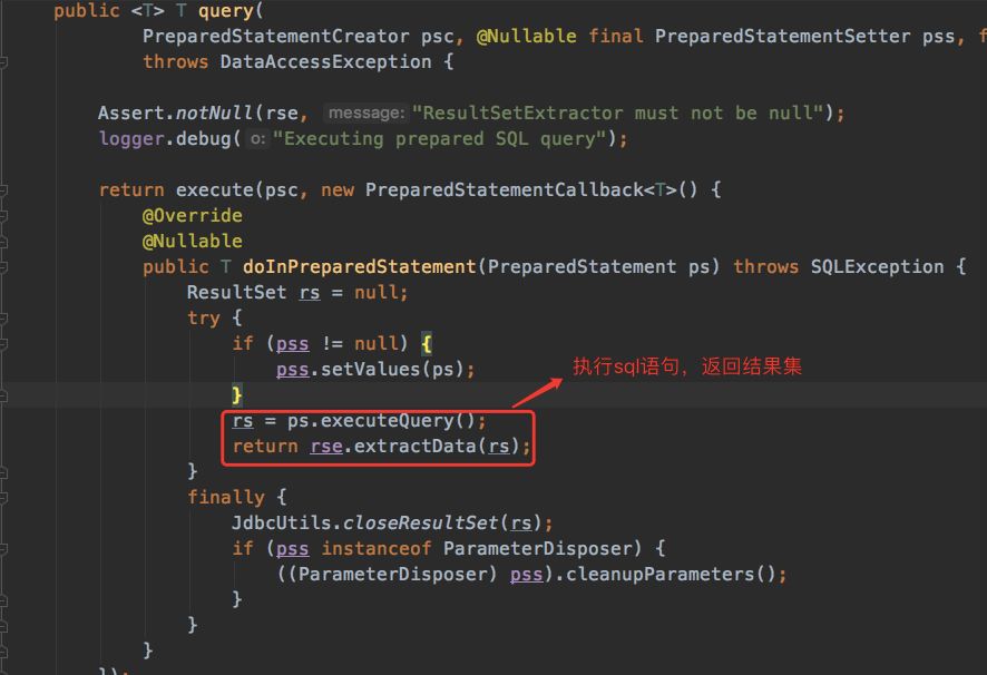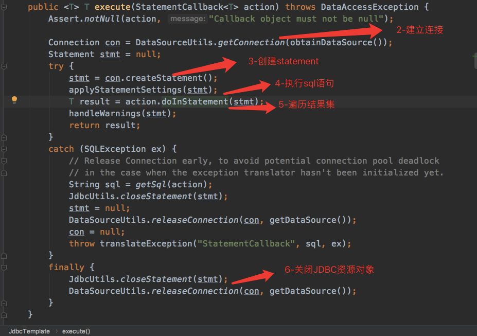 Spring JDBC,即Spring对JDBC的整合,使我们的使用更为便捷而已。各个操作方法的背后,其实也是执行了JDBC的那6个步骤: