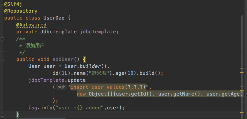 1)定义类。使用@Repository注解,声明该类为dao层的bean,通过lombok的@Slf4j注解,进行快捷的日志输出