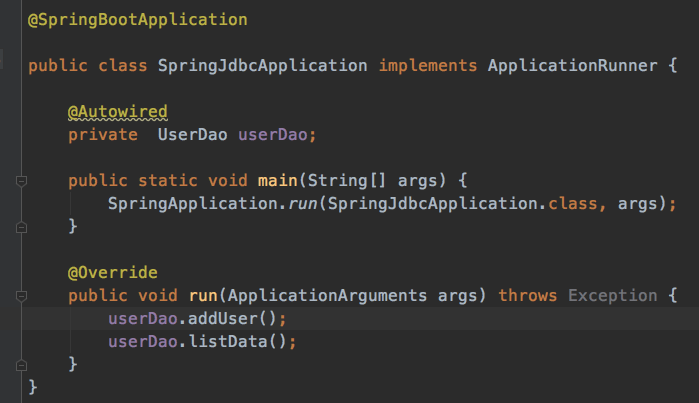 Spring Boot的启动类,实现了ApplicationRunner接口,并覆盖其run方法。服务启动时,就会运行run方法。在run方法中分别调用添加用户、查询用户列表的方法。