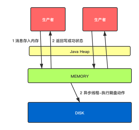 在返回写成功状态时,消息可能只是被写入了内存,并不会等待消息从内存中写入磁盘就返回。所以写操作的返回快,吞吐量大;当内存里的消息量积累到一定程度时,统一触发写磁盘操作,快速写入