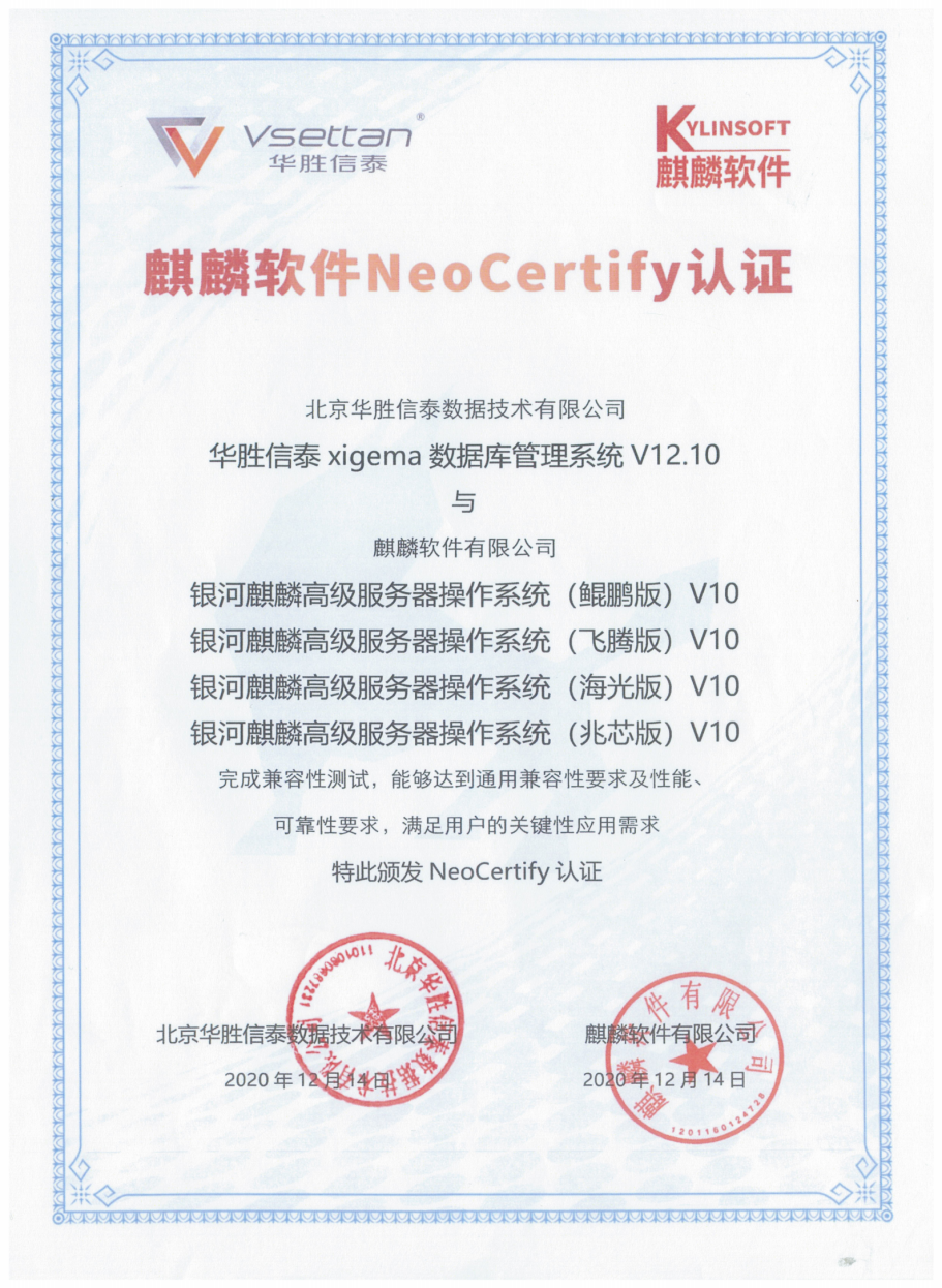 华胜信泰xigema数据库管理系统v12.10于2020年12月与麒麟软件有限公司: