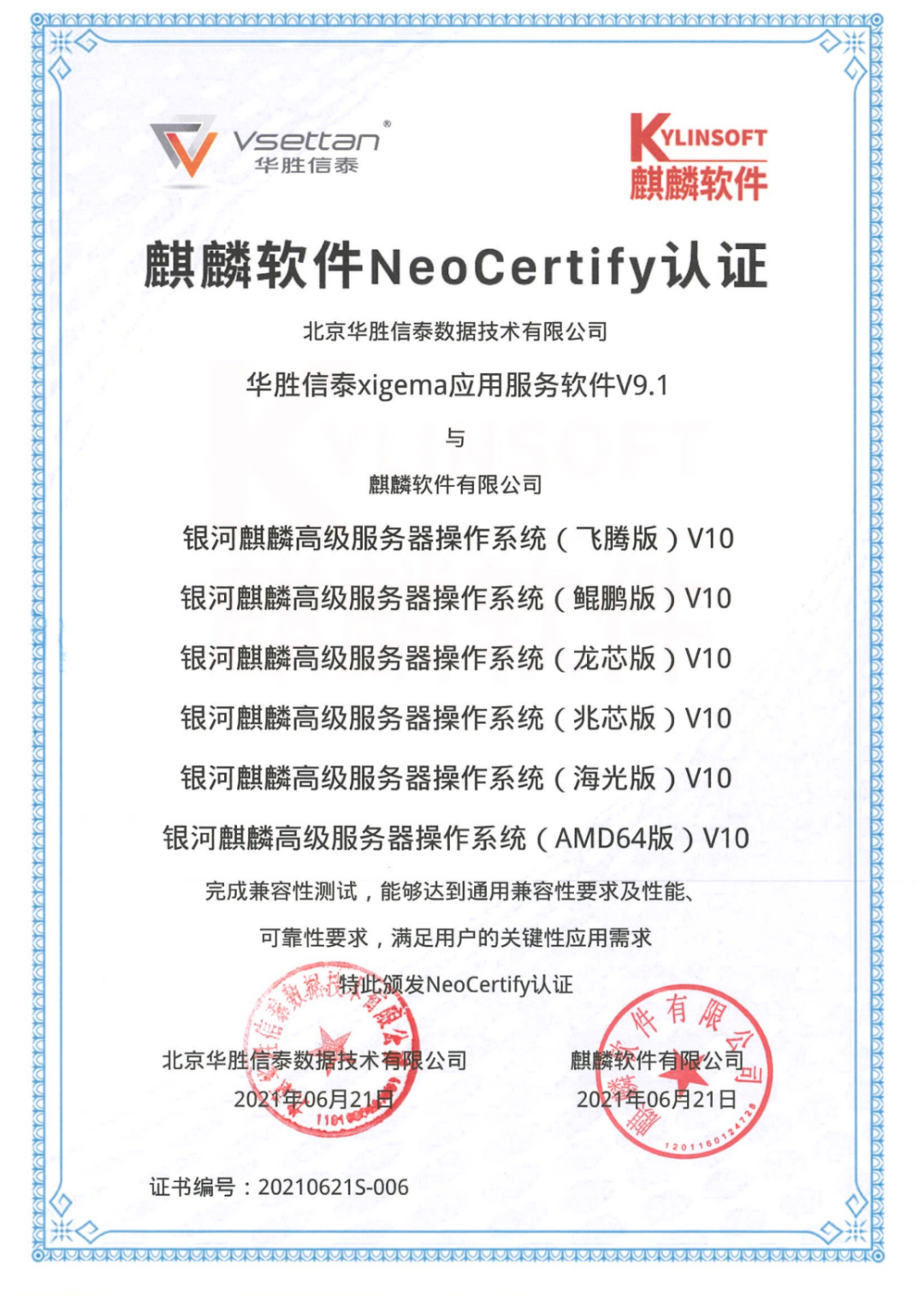 近日,华胜信泰再取得麒麟软件NeoCertify兼容性互认证证书,华胜信泰xigema应用服务软件V9.1与麒麟软件有限公司: