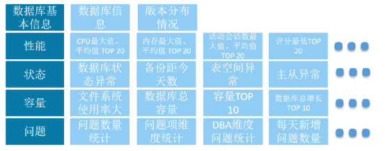 汇总报表:汇总报表是整个环境运行情况的简单巡检,主要针对性能、容量指标,可以对整个环境有一个整体的把握,明确之后运维工作的方向,对存在严重性能问题、容量严重不足的库进行紧急维护。
