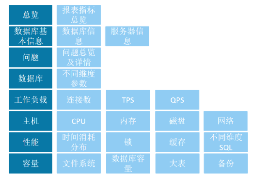 巡检报表:巡检报表是最贴近原始数据库巡检需求的报表,对单个数据库库进行深入巡检。该报表巡检项是我行多年巡检经验的总结,浓缩了运维人员的运维思想精华,最终完成对数据库全方面的健康巡检。本报表实现从工作负载、性能,到容量、备份等多维度、深层次的全面巡检。具体指标如下: