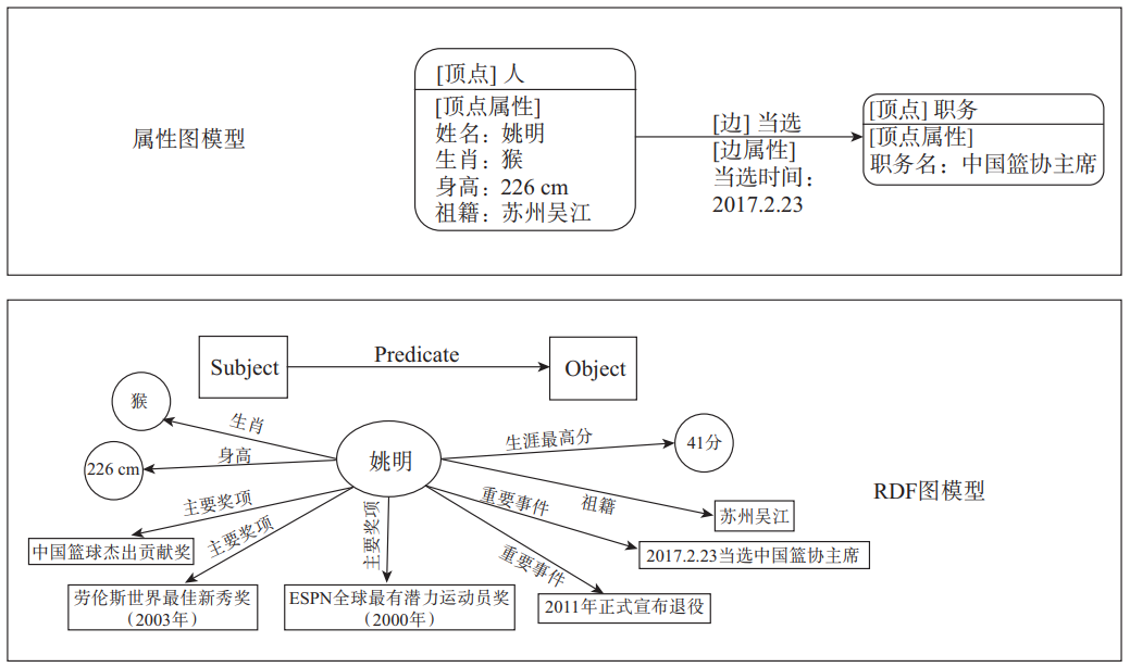 图是一组对象的集合,由顶点和边构成,顶点表示实体或实例,如人、账号、组织、业务等,它们可以类比于关系型数据库里的记录或行,或文档数据库里的文档;边是连接顶点的线,表示顶点之间的关联关系。边是图数据库中的关键概念,在关系型数据库或文档存储数据库中,没有对边的抽象概念进行直接实现。图模型主要包含属性图、资源描述框架(Resource Description Framework,RDF)图两种(见图1)。