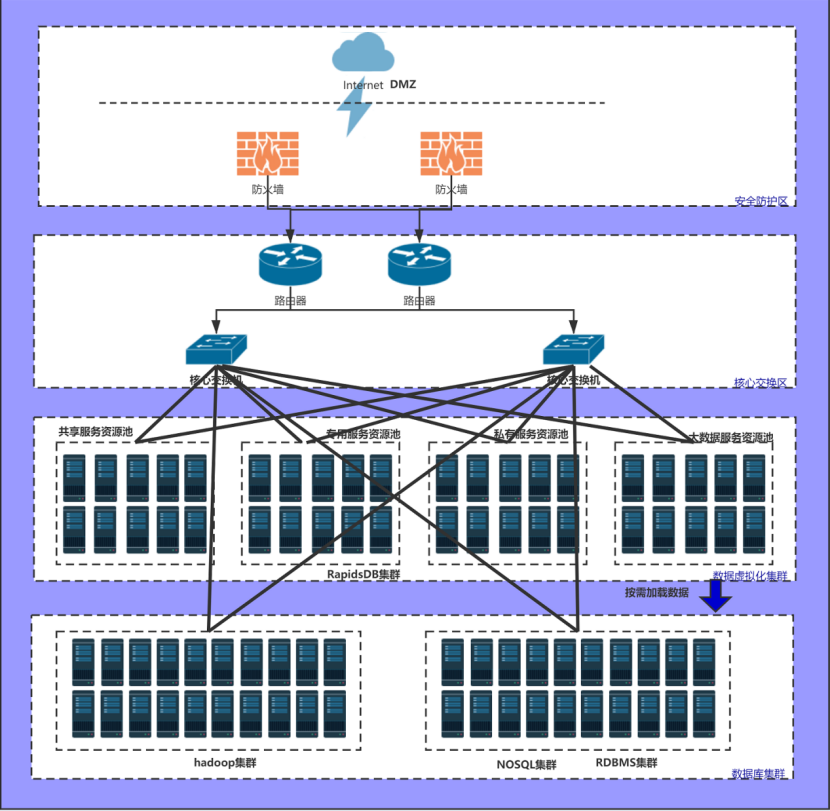 共享服务资源池主要包括了NOSQL数据库服务、微服务、消息缓存的技术服务、业务服务,数据服务等,由于共享性质肯定多人访问,业务共享库将承受巨大的访问量和并发量。平台必须提供足够多的资源作支持。共享资源池必须具备高可靠性,建议是需要单独划分硬件和分区进行管理。