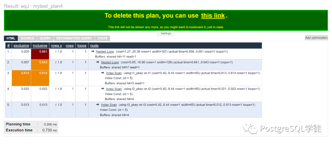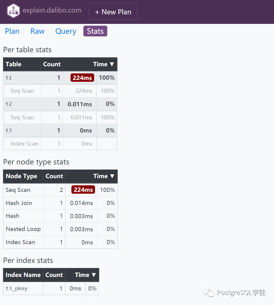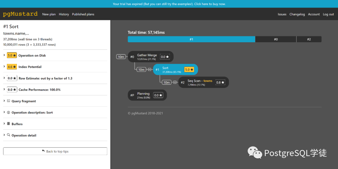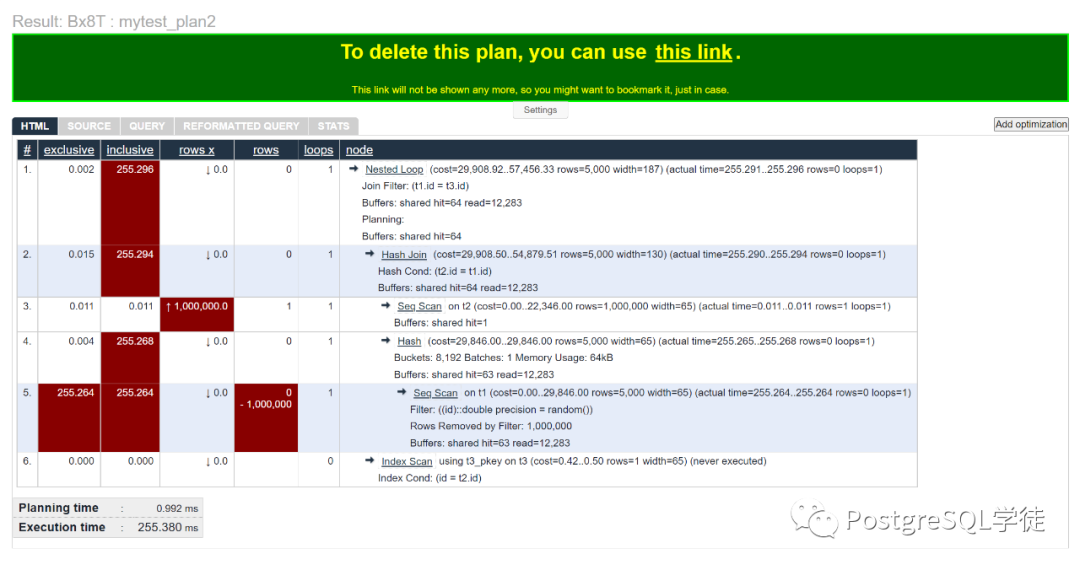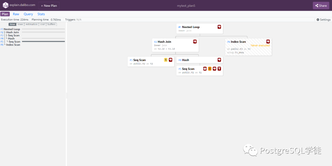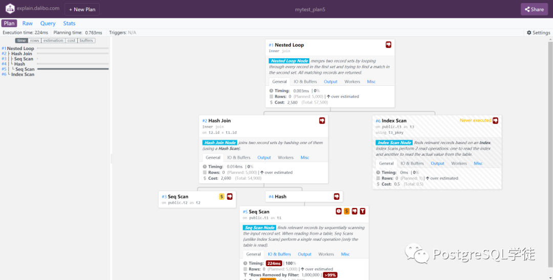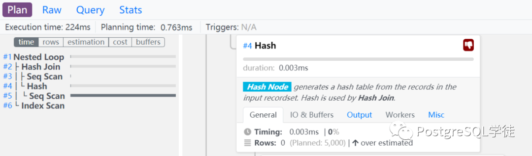 我们继续用原来的SQL看一下效果,和Depesz的是两种不同风格,左边是一个总览Overview,右边是具体的细节Details