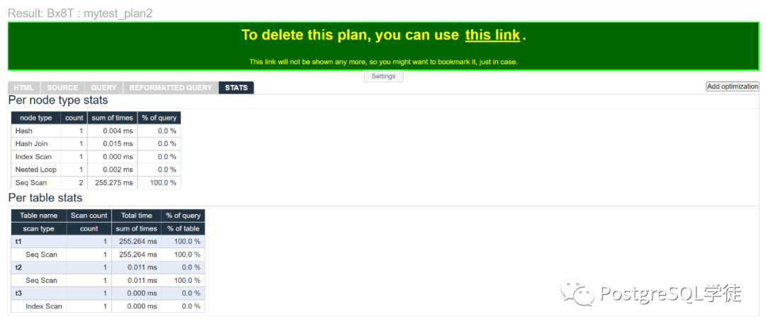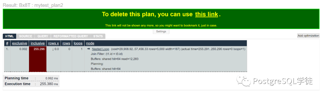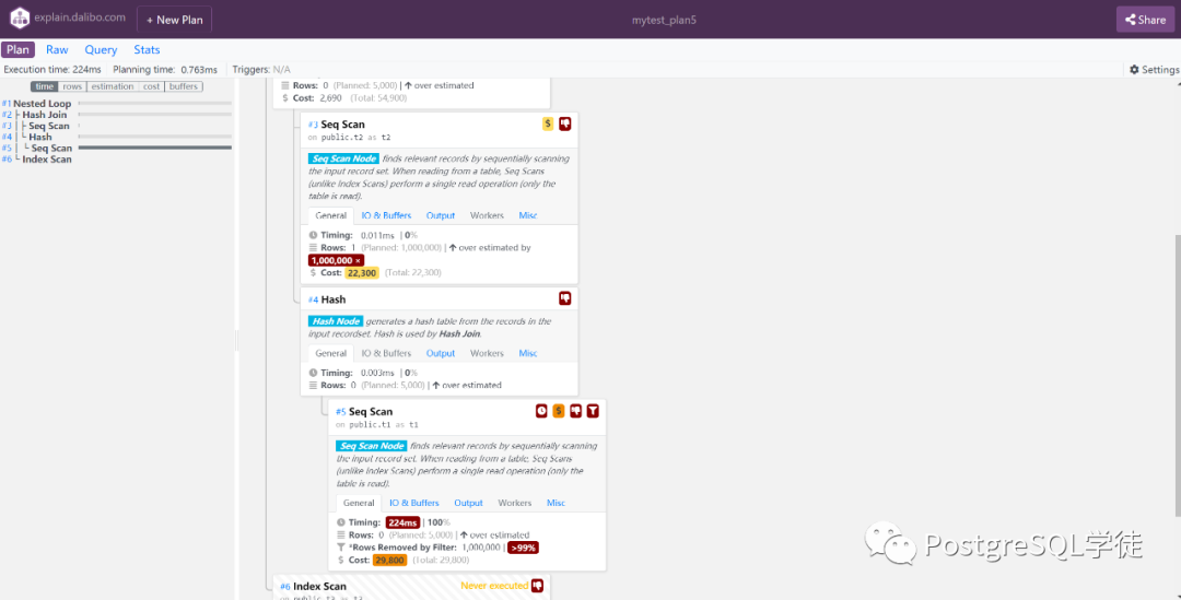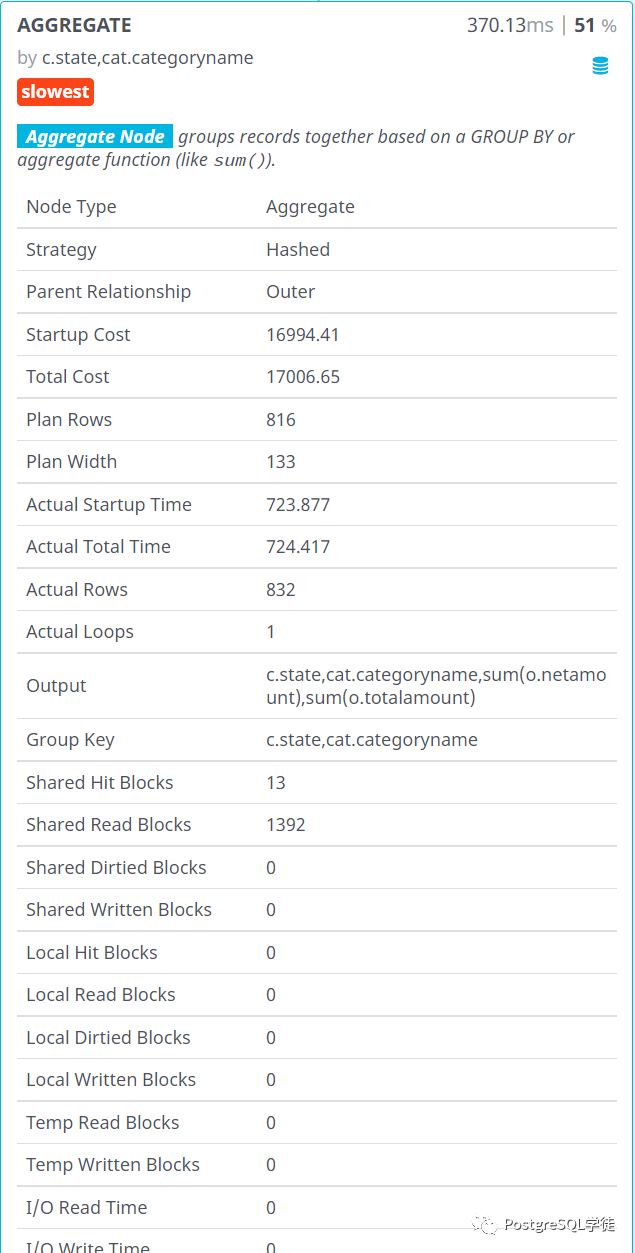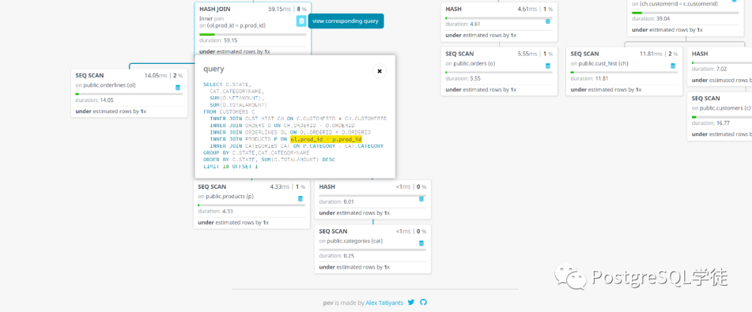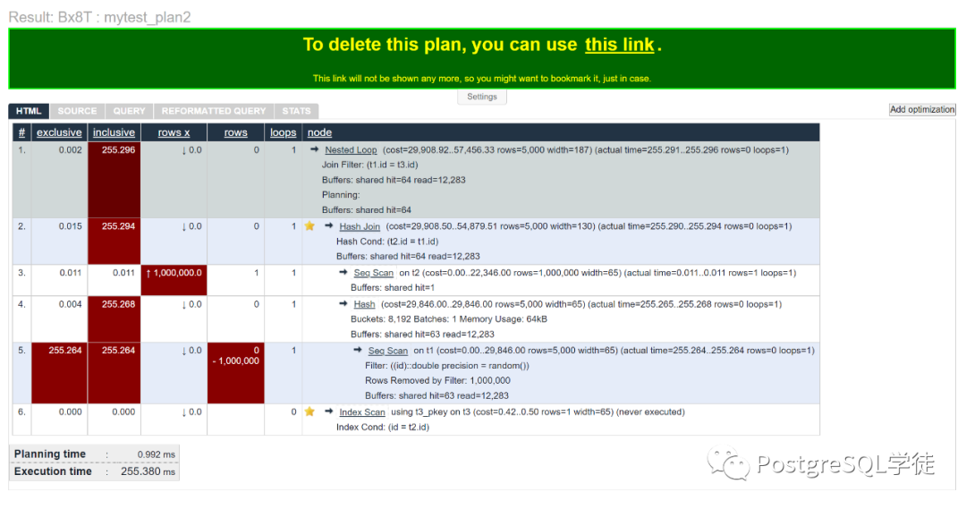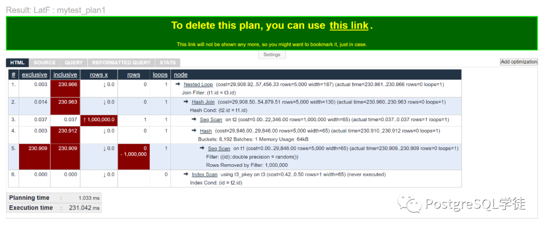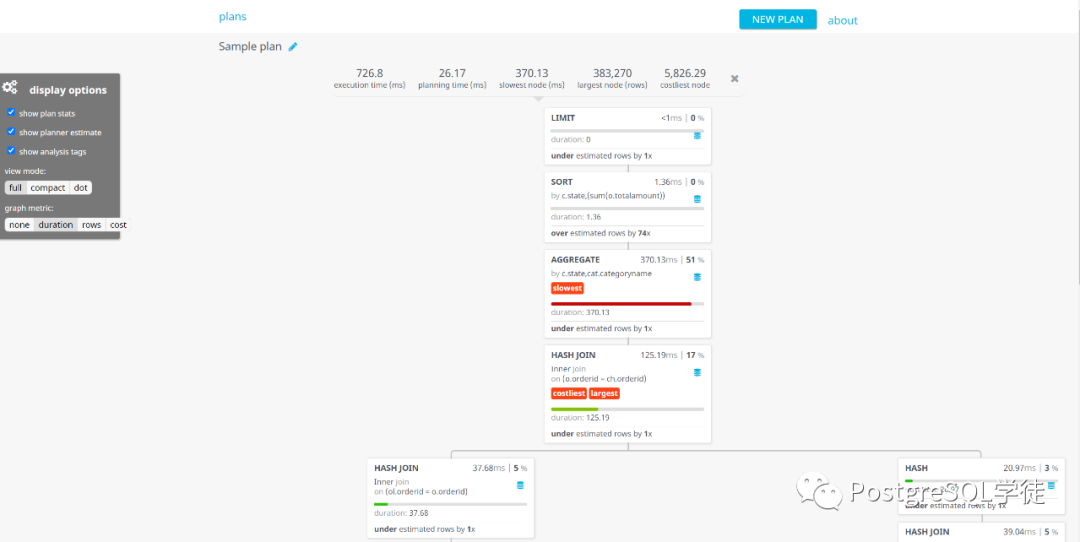 我们继续用原来的SQL看一下效果,和Depesz的是两种不同风格,左边是一个总览Overview,右边是具体的细节Details
