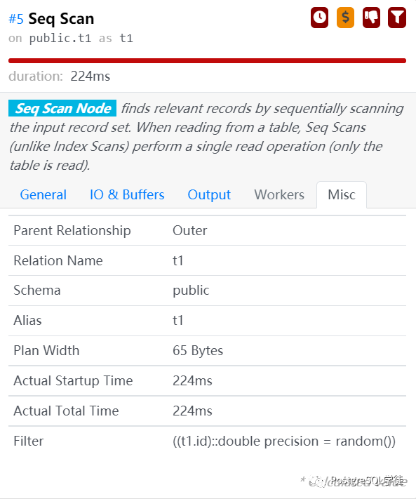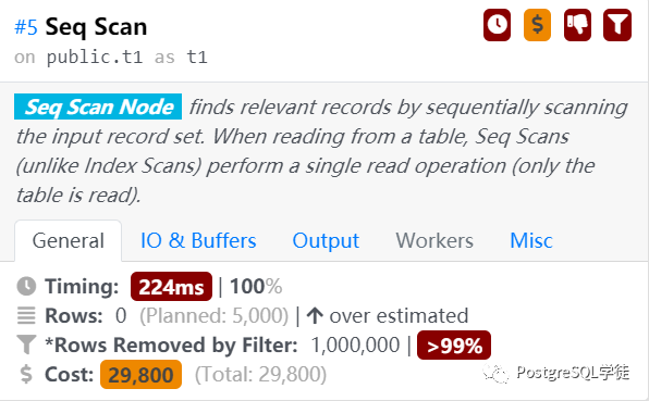 rows x:这一列可以帮我们协助分析是什么因素让PostgreSQL错误地高估或低估了返回的行数。错误的估算会用红色背景高亮,此例中我们可以看到实际返回了1行,但是预估的行数是1000000,100万,可以看到,此时优化器严重估算错误 (实际原因是因为等于条件为random())
