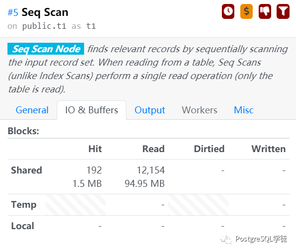 buffers命中了1.5MB,读取了95MB,另外还会显示出Dirtyed,比如shared_buffer太小了,bgwriter进程没有维护好足够多的buffer,那么backend process得自己去找合适的block,假如更不巧还是脏块的话,还得做刷脏的累活